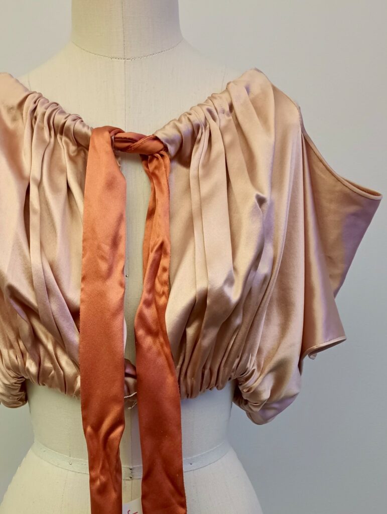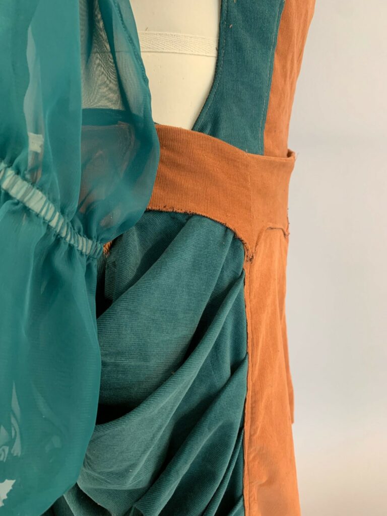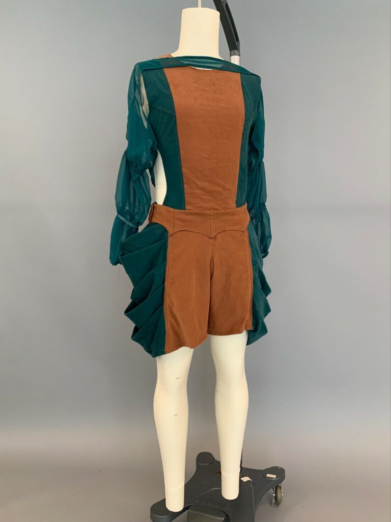 Our design is a color block top with cut out, color block shorts with drape detail on side, and a gathered bolero. We chose brown and green as a colorway. The top and bottoms are made entirely of corduroy and the bolero is made of a green chiffon.