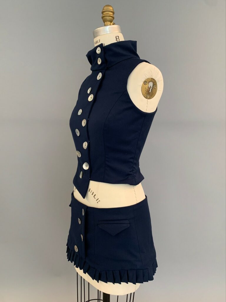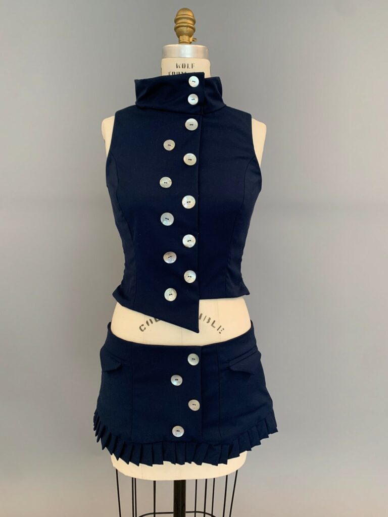 The set features a high-collar asymmetrical vest and a mini skirt. Emphasizing precision and sophistication, both garments showcase meticulously aligned princess seams and asymmetrical overlapping button plackets. The vest incorporates a harmonious fusion of functionality and embellishment, with one row of buttons serving a practical purpose while the other adds decorative flair. Meanwhile, the skirt’s asymmetrical button overlap is faux, with the actual closure discreetly concealed by an invisible side zipper, ensuring seamless elegance and ease of wear. Taking inspiration from the pockets of our various inspiration pieces from the CF+TC, the skirt incorporates functional welt pockets with flaps that harmonize with the vest’s pointed silhouette, forming a seamless diagonal line that draws the viewer’s gaze effortlessly across the ensemble.