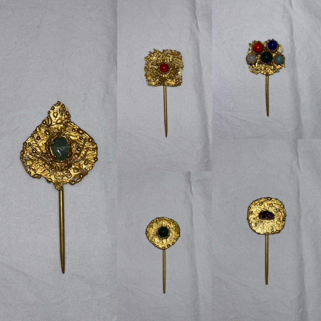To engage with fashion is to synthesize a story. The context and manner with which one adorns the self are puzzle pieces to the art of documenting time, emotions, and identity; every work of fashion holds within it a montage of the past, present, and future. Objects no. 2023.19.001, 2023.19.002, 2023.19.003, 2023.19.004, 2023.19.005 in Cornell Fashion + Textile Collection, an assortment of five metal hair ornaments embellished with vibrant stones at the core, is a sterling instance of such storytelling.