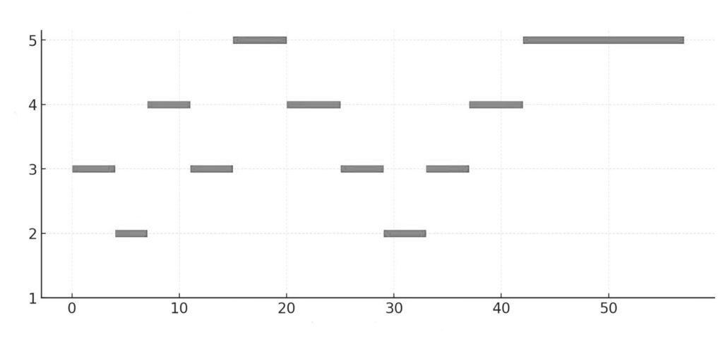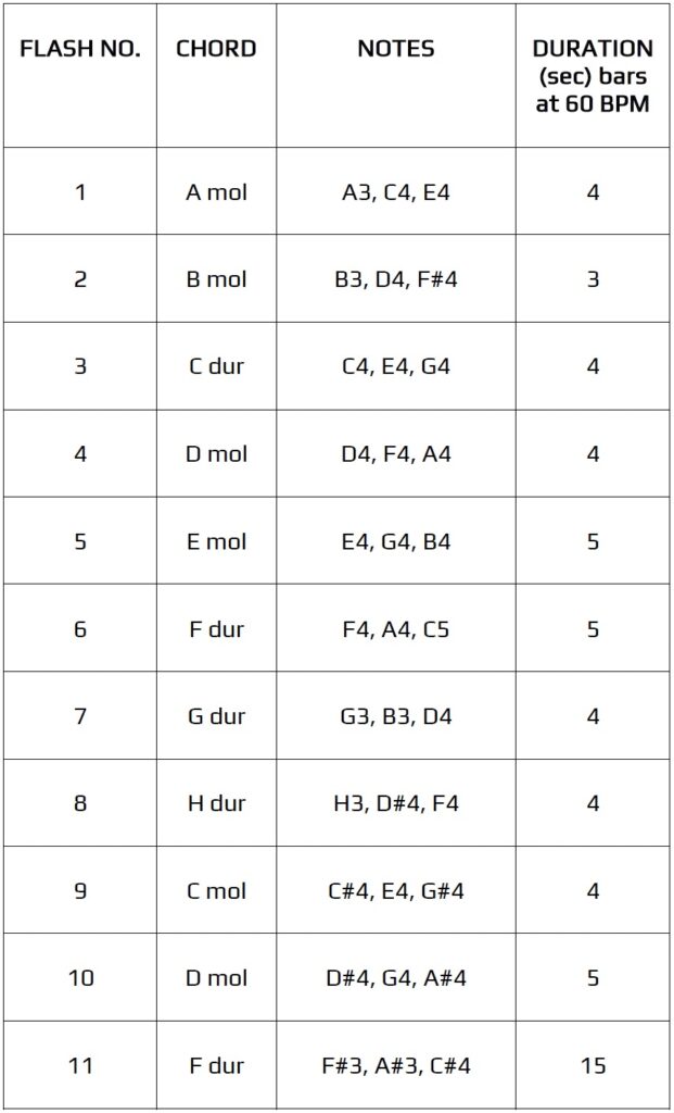 Using a table of recorded flashes, I developed a system to translate light impulses into musical chords, where each flash in the video becomes a coded symbol, interpreted through principles of intensity, duration, and rhythm. Each flash is interpreted as a unit of language. The number of consecutive flashes determines the corresponding letter (1 flash = A, 2 = B, and so on). The resulting sequence of letters is then musically interpreted as a sequence of chords, each chord corresponds to a letter (e.g., A = A minor, B = B minor, etc.). Also, each flash is considered as a sonic impulse, with its duration and tonality assigned according to its visual characteristics (intensity, length, and rhythm). Within the video, eleven key moments were identified.