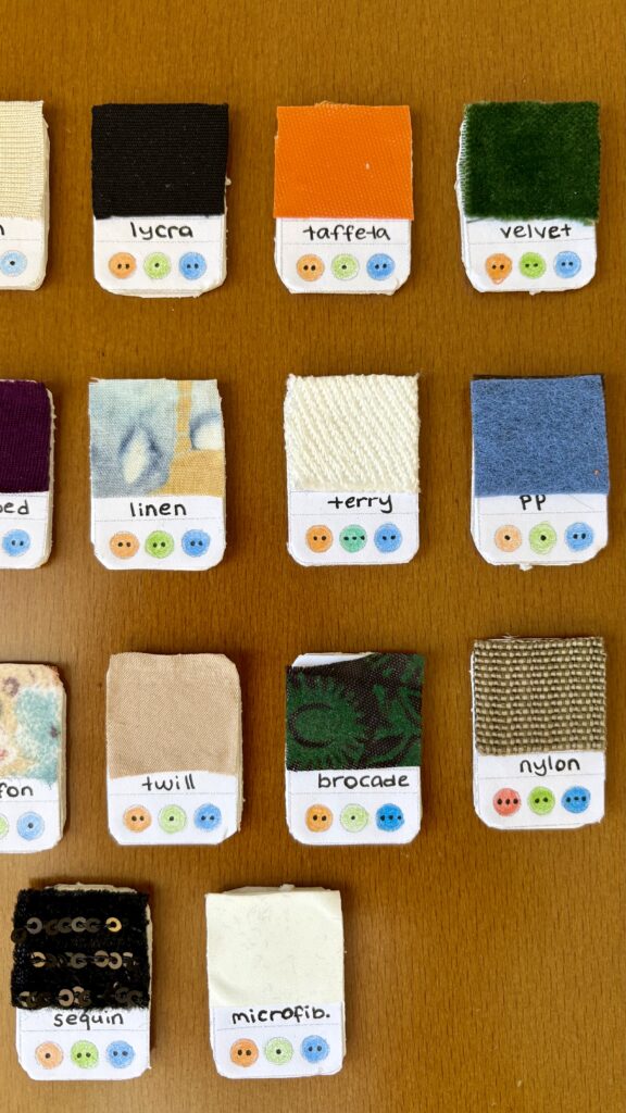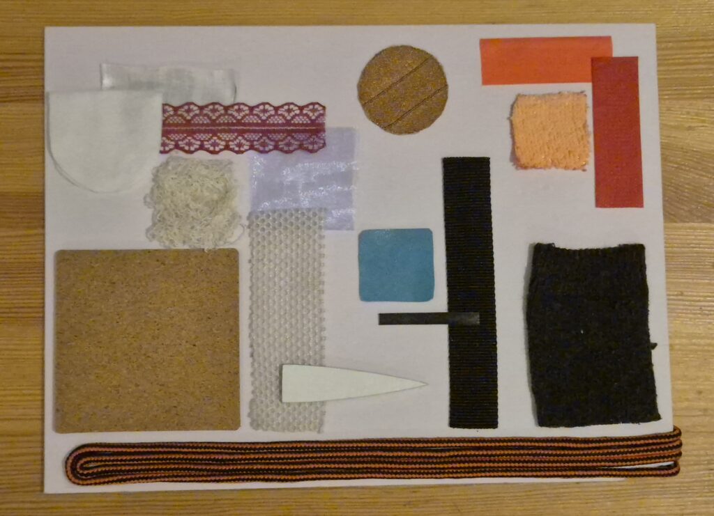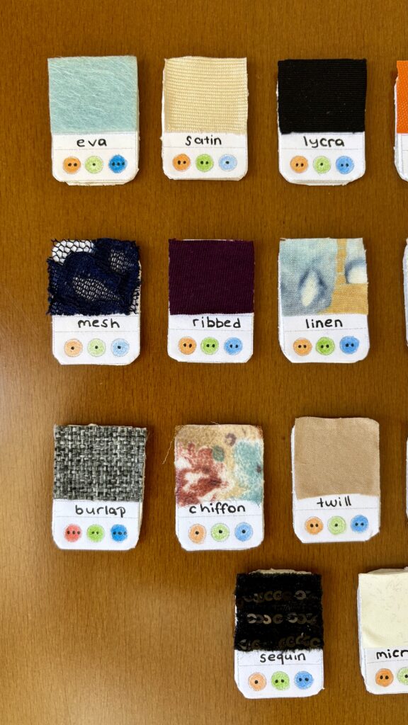 “For my touch board I began by exploring what I already had at home. I first focused on fabrics, collecting pieces from different garments such as a soft jersey from an old T shirt, crisp poplin from a shirt, a section of corduroy, and a strip of linen cut from worn trousers. Each fabric offered a different personality, some elastic and flowing, others firm and structured. I observed not only their surface textures but also how they behaved: how they folded, how they caught light, and how well they held their form. Bending, layering, and viewing them under different angles became part of the discovery. As I progressed I realized I did not need to limit myself to textiles. I began adding materials that speak with other senses such as a piece of mosquito net mesh, a length of straw rope, a spare bag handle, EVA foam, a knitted fragment, and even a square of bubble wrap. While searching for a way to present these samples I found a check patterned cloth at home. Its grid inspired me to mount each fragment within its squares. As a student who moves between dorms and travels frequently I am always aware of the need for portability and compact storage. Using fabric instead of a rigid board reflects that reality. The cloth can be folded, packed, and carried easily, turning the touch board itself into an example of adaptable design.”
