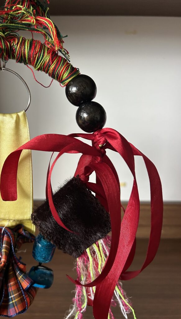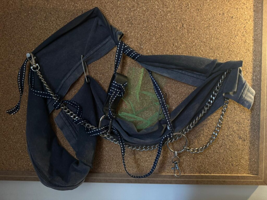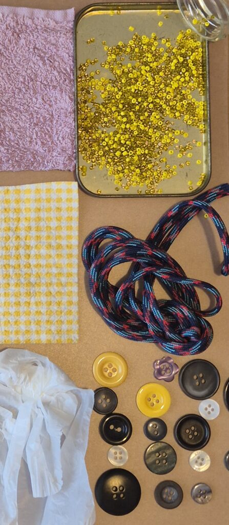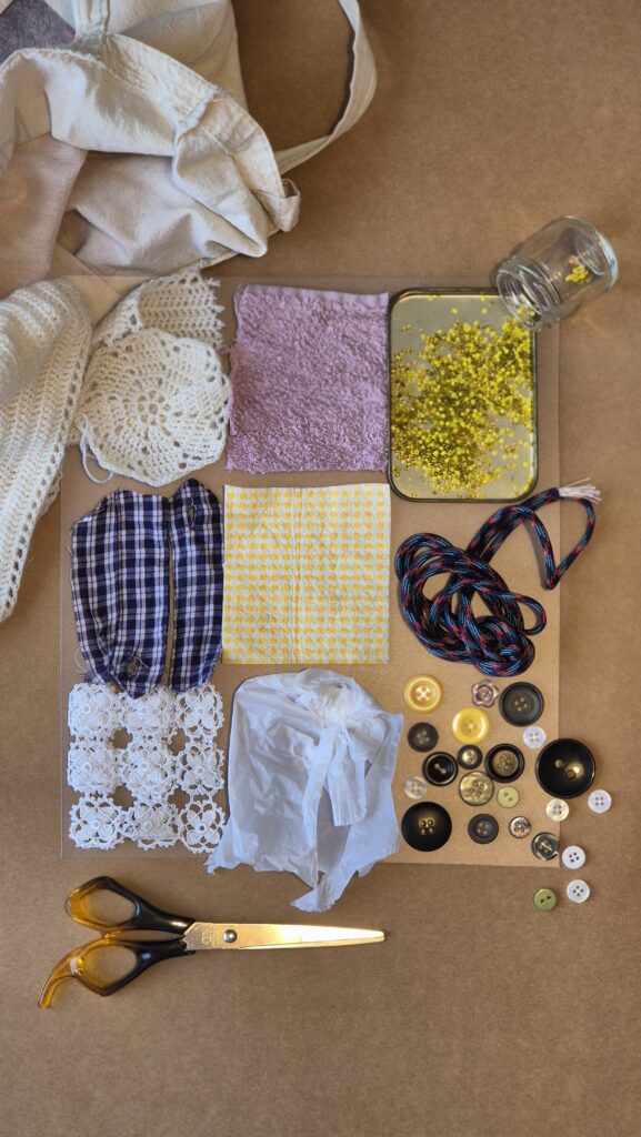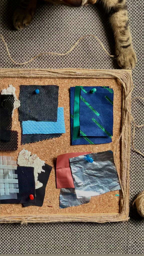 “I created this touchboard solely with the materials that I found at home. I divided the materials into three columns. From left to right, in the first column I sorted all the materials that were leftover from various projects: the yarn consists of scraps left over from my mother’s crochet projects as well as the dantela, while the fabric was salvaged from a shirt I modified. In the second column I gathered an old towel, once used daily in the bathroom, a piece of a cleaning cloth and a piece of a plastic shopping bag. These three led me to question the materials we typically throw away but could instead transform. Besides the core materials, in the third column I tried to find additional textures and details, like buttons and beads, that could be incorporated into the bag’s overall design or used functionally, such as the rope for handles. The touchboard also serves as an exploration of material potential, demonstrating how different fabrics can be manipulated. Some materials accept stitching, while others are better suited for crocheting or forming various knotted shapes.”