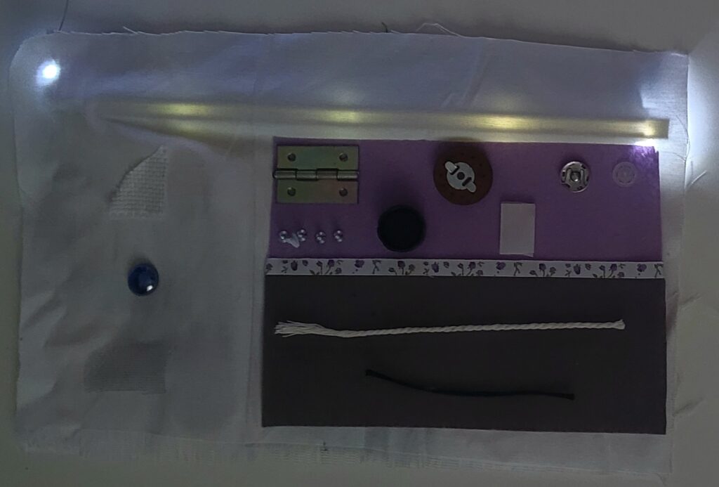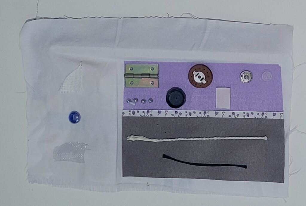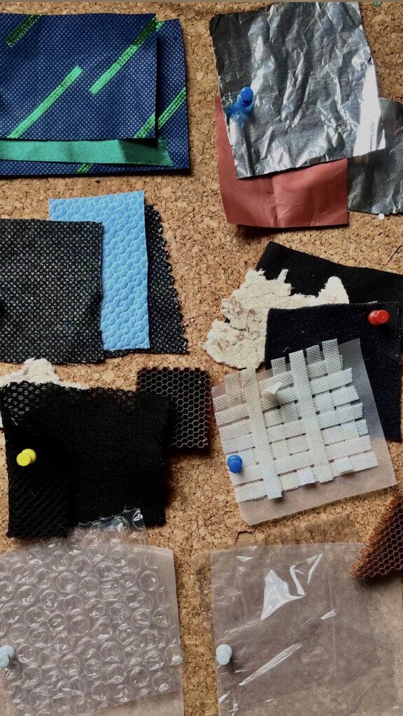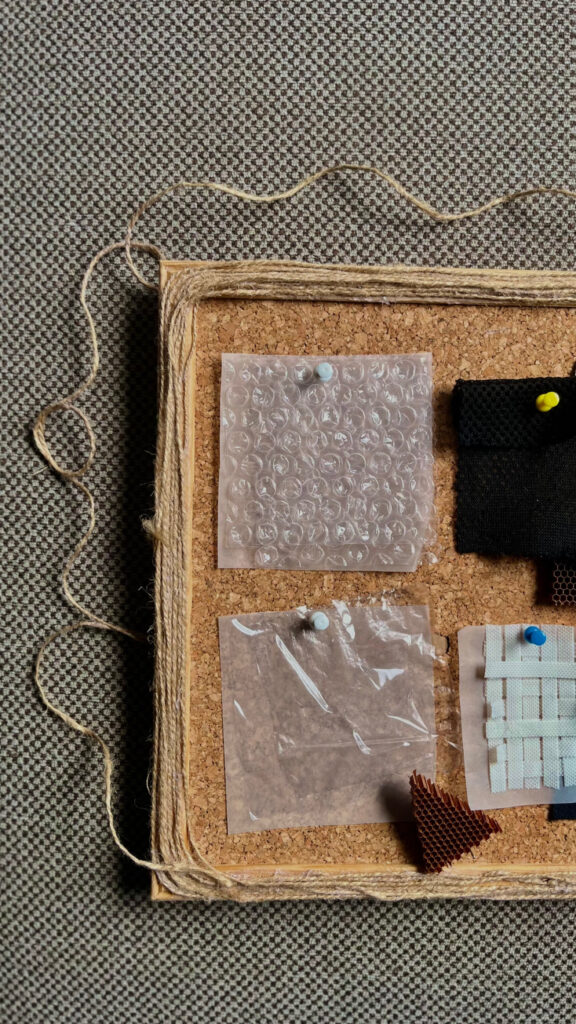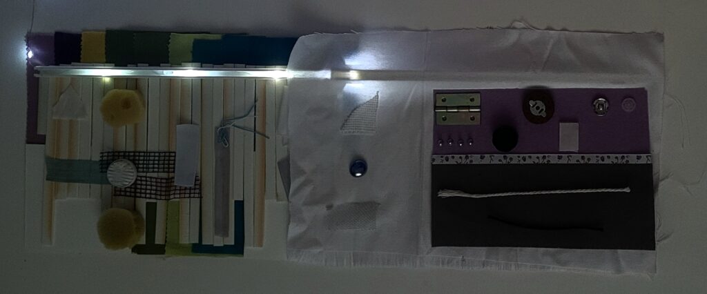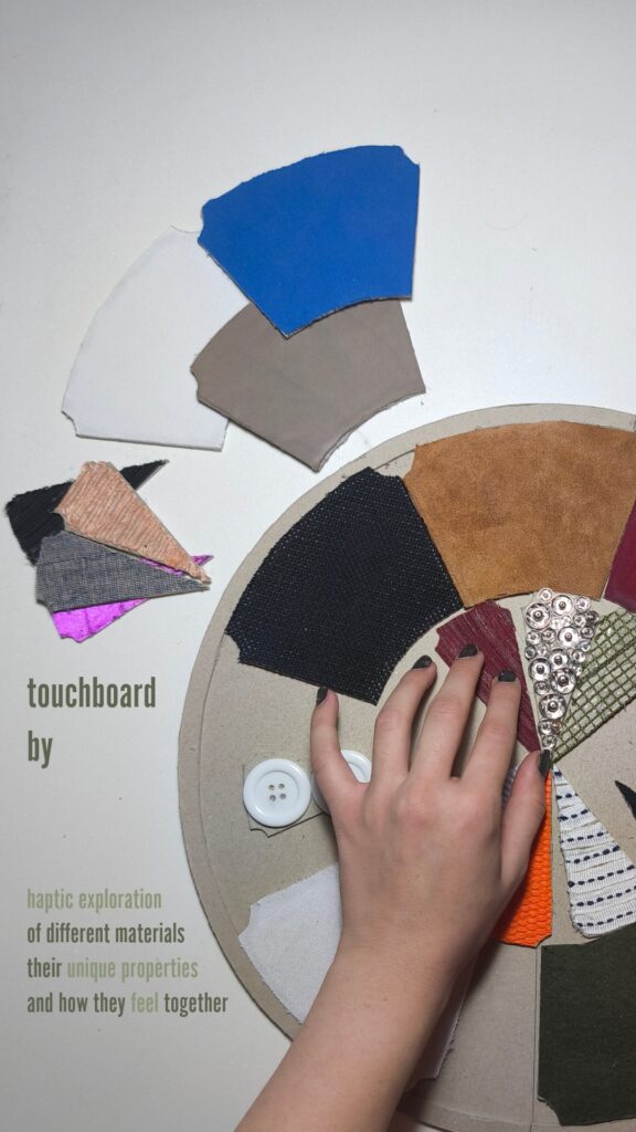 “For my touchboard, I selected materials that stimulate the senses and invite exploration. I began on the far left with fully transparent elements. The idea was not only to explore each material on its own, but also to create a sequence where one sensation naturally leads into the next. So I began by placing Bubble Wrap beside a semi-transparent fabric with a textured surface. This transition continues with a fully opaque fabric of similar texture, to see how light transmission changes our tactile and visual experience of the same structure. Building on the three-dimensional, flexible quality of bubble wrap, I included hexagonal patterned material and ridged adhesive tapes, which amplify the sense of touch through both form and flexibility. To emphasize contrasts, I positioned clear plastic next to a soft plastic bag, encouraging comparison between rigidity, elasticity, and their different sensory effects. I also paired a polar fleece, which evokes warmth, with a smoother fabric, and placed these beside a recycled paper made from waste pulp. This rough, irregular surface introduces the idea of material continuity while also highlighting stark textural opposition. On the far right, I arranged those that primarily engage sight. Moving downward, their metallic sheen and crinkling properties grow stronger, thus also activating the auditory sense. This progression demonstrates how different materials can overlap in their sensory impact, combining vision, touch, and sound in a single interactive board.”