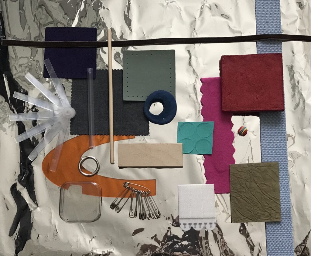 “I created the touchboard using materials I’ve worked with in my past projects. I think that while observing a design student’s education process, seeing how our use of materials evolves over time and also how it changes depending on the product category could be a fitting starting point for this project. My main filtering qualities for the board were temperature and texture, but I also considered other sensory aspects such as sound, friction, and smell. I arranged the materials from warm to cold (top to bottom), and from smooth to textured (left to right). I chose materials while thinking about possible parts of a bag, which also made me consider the sound they produce; the clink of metal or the silence of velvet. The materials I used include velvet, synthetic leather, suede, ceramics, felt, paper, paint, wood, metal, plexiglass, plastic, and a variety of weaving patterns, fabric types, and shapes to create various experiences.”