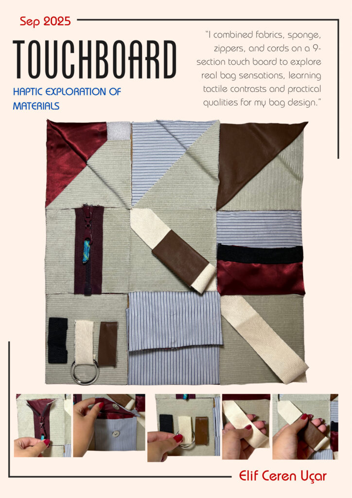 “In industrial design, nothing we learn or use goes to waste. If we see a box, we say, “Keep it, we’ll transform it.” I still use the cardboard from my first year; now, in my fourth, I design with it. Design is not a single stage: at every stage, we learn and build. I adopted the same approach in this bag idea. I built my touchboard around flexibility and layering — the qualities a designer needs. Inside the bag, the same material can reappear later; a wooden stick from second year may find new purpose in fourth. For this reason, I wanted to understand what each material is by touching, seeing, and holding it up to the light, because if we don’t know the material, we can’t correctly define its function. When brought together, they can become a conceptually cohesive bag and support spot decisions. I deliberately chose the lower layer’s materials: linen for a sense of strength; stretch suede to evoke “fixed when decided, stretchable when needed” behaviour; elastic bands, ribbons, and silk/cotton threads to show the continuity of connection. Foam and leftover 3D-printed parts can always be used as support elements. My favourite detail is light: it guides in low light and lets us test “how does this material behave under light/backlighting?” Interactions of the upper layer; in some areas of the bag, blind interaction should be safe and quick; in other areas, this interaction should be limited to prevent unintended opening. In short, the design is inclusive yet customizable; it shifts with perspective. My touchboard reflects one state of my bag, and the bag will become holistic through these interactions and materials.”