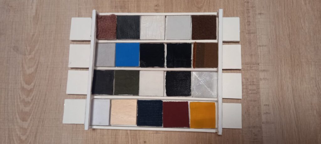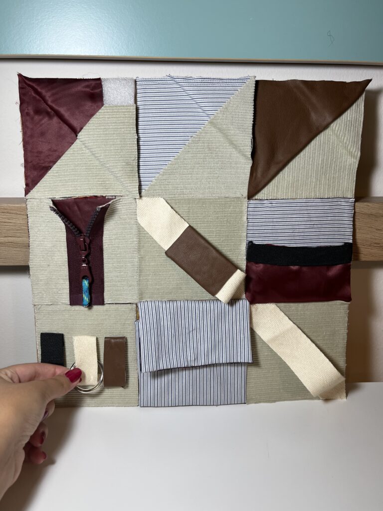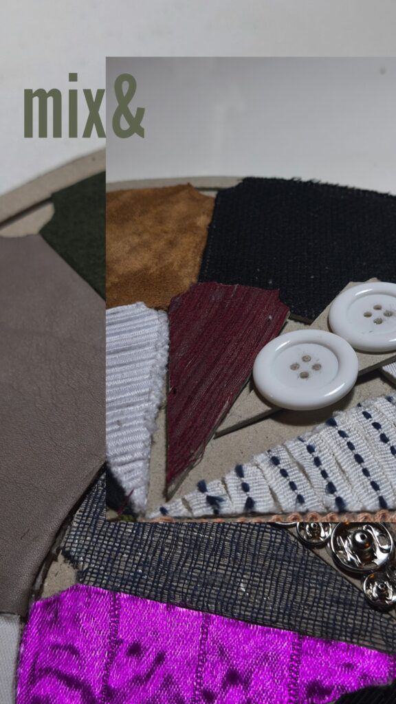 “I created my touchboard to show how important combinations are in the design process. I wanted to focus on the idea of touching fabrics and experiencing their different variations by direct interaction. On my touchboard, I placed seven different fabric samples. These include materials such as artificial leather, viscose, and polyester. Each fabric has its own surface and feeling, so when we touch them, we can notice how different they are from each other. The board can also be changed easily, because we can replace or add new fabrics. By doing this, it becomes possible to explore new variations of both fabric types and colors. This creates many new options, which can sometimes make the design process more confusing, but also more creative. Having more choices pushes the designer to think more deeply and make careful decisions. Another important point is that this idea does not have to be limited only to fabrics. For example, when creating a bag design, we can also use other materials such as metal pieces, zippers, or plastic parts to build another combination board. In this way, we can see not only how fabrics work together, but also how different materials can be combined in one product. My touchboard is therefore not just a simple fabric card, but a tool to experiment, to feel, and to think about design in many ways. Among the samples, my personal favorite combination is the brown leather and the gray polyester with a blue undertone.”