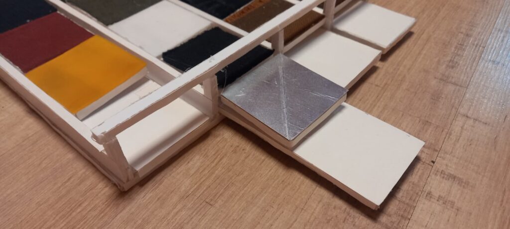 “I designed the material board in the form of a frame, allowing the collected materials from different places to be observed and touched through it. The initial categories I created were divided into shiny surfaces, fragmented surfaces, traditional textures, and accessories.”