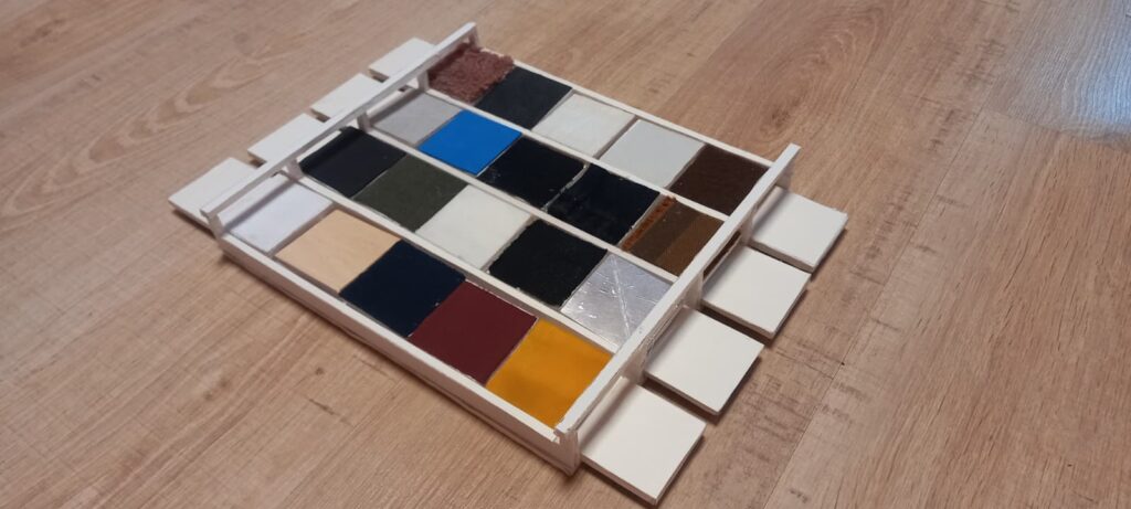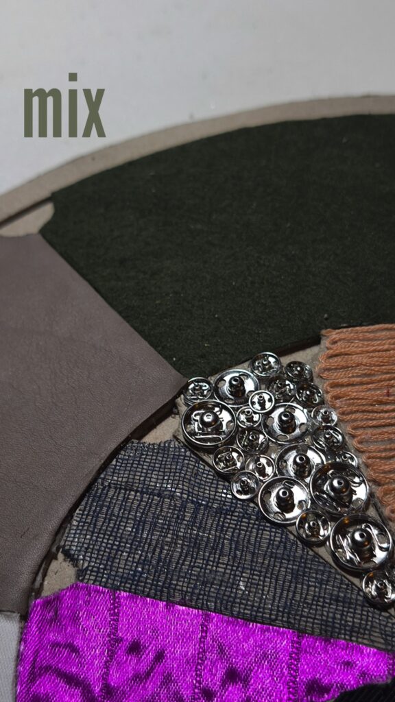 “The material selection process was mostly focused on finding samples with unique textures, and then color variety in said samples. Most of the materials that have been picked were left over from previous projects from design studio classes, samples collected during my internships, or craft materials for my hobbies. Around a third of materials are ones I have purchased to match or clash with the ones already at hand. In order to better visualise the compatibility of materials in terms of physical features, I have decided to create a circular board. This form allows to easily slide parts along a circle, in turn, making it easier to do quick changes between materials instead of taking pieces out and switching their places everytime. Pieces can still be taken out and placed wherever depending on their size. The aim was finding the balance between different textures by not only seeing, but also interacting with the material. The experience of touching pieces one by one, seeing how different fabrics reflect light, scratching and tapping materials to hear the noises they make, and feeling how they conduct heat to my hand was a real sensory rollercoaster.”