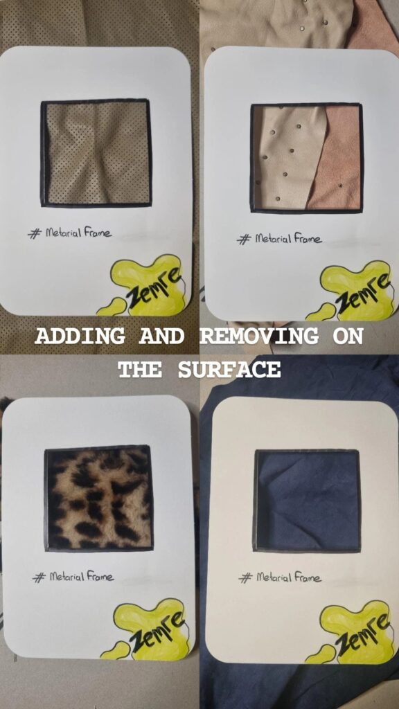 “In creating this touchboard, I aimed to gather materials with different sensitivities and intended uses that I saw around me, to observe and experimentally explore their relationships. Some were materials I quite liked and preferred in my daily life, while others were less relevant and less knowledgeable. Within the scope of the project, I had the opportunity to examine and evaluate all of them. I observed how the potential of a material on its own could be impacted when combined with other materials. I categorized them by considering the possibilities its texture offers in production and its adaptability to the bag.”