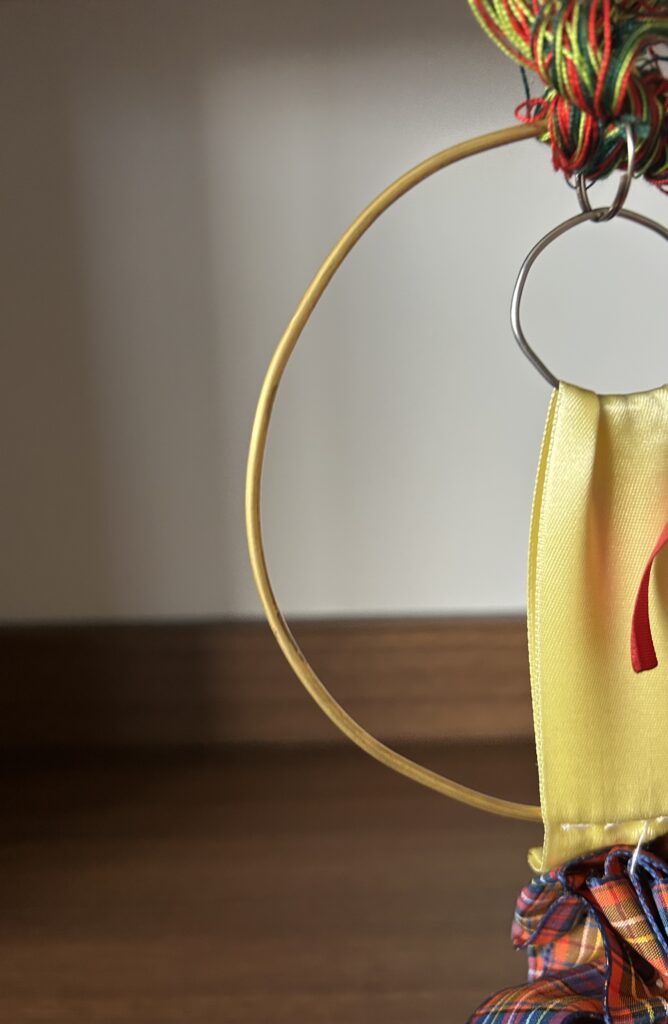 “My board is a circle structure, with a circle within a circle and an intermediate circle that allows it to remain on the same plane. The tightly sewn fabric piece, due to its tension, remains firmly in place on the central body. It also serves as a separator between the void and fullness of the circle. I used wire, fabric, and beads as materials. I dimensioned the fabric using various techniques. While the elements create an order within themselves, they also create a complex appearance overall.”