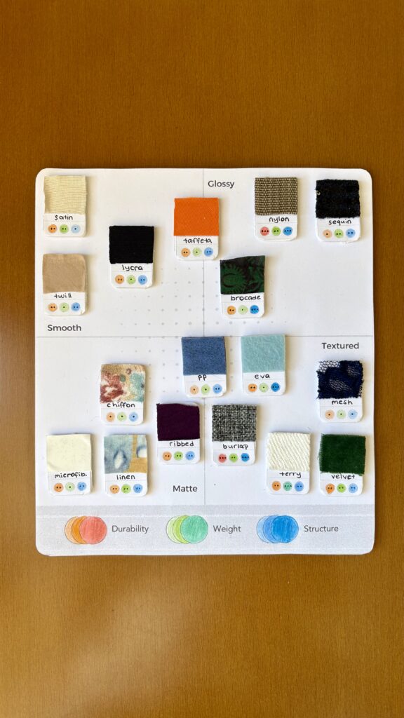 “This material touchboard i created explores the tactile and visual qualities of diverse fabrics while simultaneously evaluating their functional properties for potential use in bag design. The diagram is organized along two main axes: Glossy – Matte on the horizontal and Smooth – Textured on the vertical. This layout allows for a clear comparative reading of how materials behave visually and sensorially. Each fabric sample is labeled with its name and evaluated according to three key criteria: Durability, Weight, and Structure. These criteria are represented with colored button icons, creating a simple and accessible coding system that helps to quickly identify the strengths and weaknesses of each material. For example, nylon webbing scores high in durability and structure, making it ideal for straps, while chiffon is positioned as lightweight and decorative, suited only for accent details.”