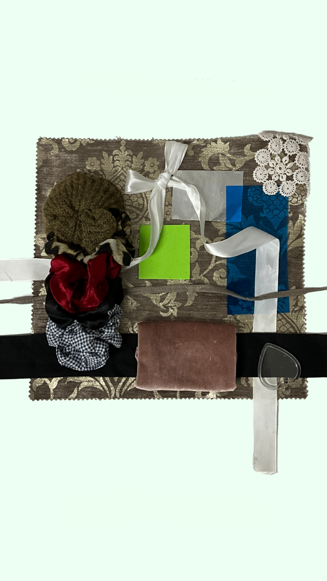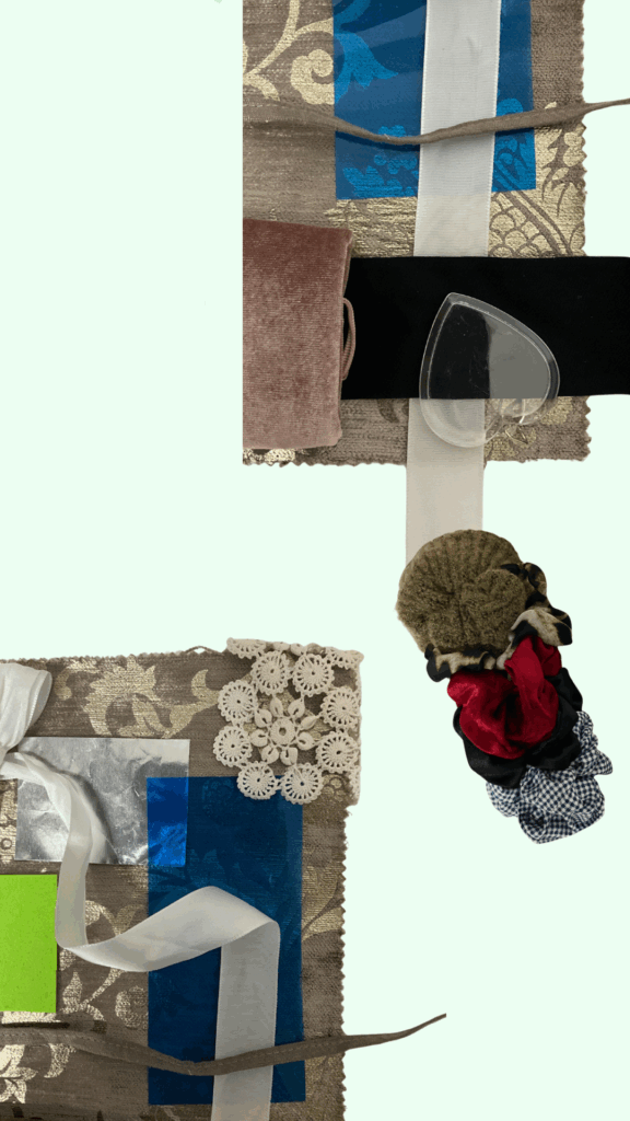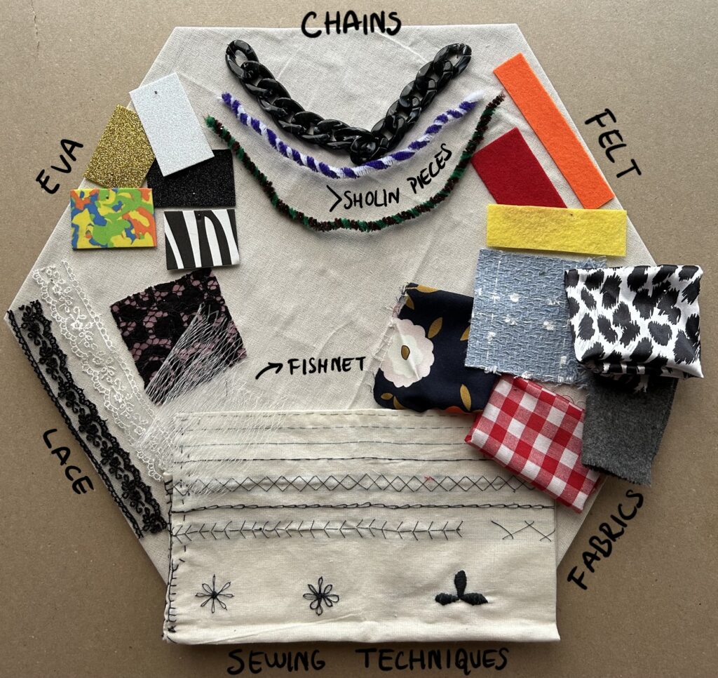 “I created this touchboard by revisiting the materials and techniques I had used in my previous projects. My aim was to combine and explore different types of textures and structures. This included fabrics, EVA, felt, lace, chains, and sholin pieces. When selecting fabrics, I paid attention to texture, elasticity, and yarn structure. I used stretch-printed fabric, cashmere fabric, woven fabric, poplin, and polyester. For a wider variety of fabric and texture samples, I also collected leftover fabric pieces from my school’s workshop room. While working with fabrics, I also explored different types of patterns. To better visualize how the materials would look together, I pinned them onto the board so they can easily be removed and compared side by side. For the lace, I wanted to experiment with various textures, so I combined lace with fabric in one piece and also added a fishnet-like texture. For felt, I focused on textures ranging from soft to hard as well as opacity. With EVA, I explored different surface glosses, shimmers and patterns. Among the chain options, I included a multicolored chain from an unused dress that I found suitable. To create softer textures, I also combined different sholin pieces. In addition, I experimented with different stitching techniques for thread details, which I used to connect fabrics or apply as surface patterns, and incorporated these into my board.”