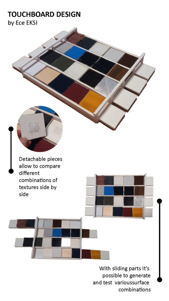 “The touchboard I created was mostly assembled with leftover materials that I used in my previous design projects. To be honest, I had already forgotten some of these materials existed under my bed, and I re-discovered them. But unlike before, I believe I comprehended these materials’ qualities and features better through this board duty. And it was fun to test different combinations of different surface frictions. I used various materials such as wood and aluminum, but most of them can be grouped into two: fabric and plastic. For fabric, I used: denim, plush, parachute, felt, linen, cotton, polyester. For plastic, I used: LDPE (plastic bag), PET (a 3D-printed piece), polyurethane, imitation leather, EVA. The touchboard constructed from sliding and detachable parts, which makes it possible to generate various arrangements of textures.”