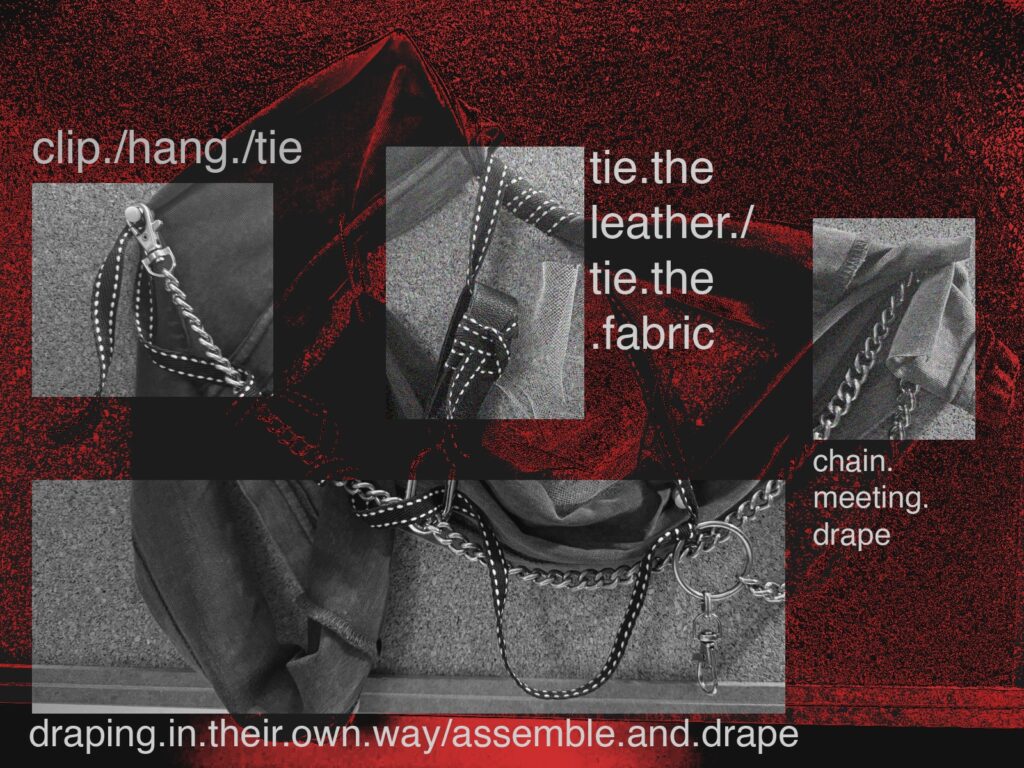 “Exploring the flow, assembly, interaction and mainly the draping of different materials. How their various interactions affect their form, their layering and the draping. Chains, strings, pins, fabrics, leather, metal; some of the materials that can be tested through their flowing and draping capabilities. Allowing for observations on form, assembly and haptic qualities of them.”