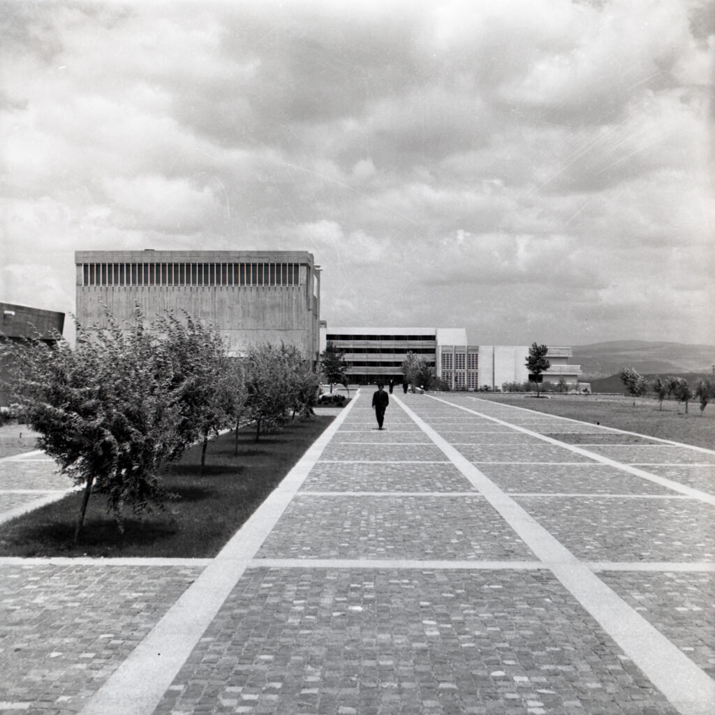 The idea of growing into a technical university and moving into a campus was inscribed in the initial institute. The UN-supported faculty had been working on competing schemes for the campus master plan for a few years when constructing one became economically feasible in 1959. Their proposal, devised for a hill on the city’s outskirts, composed the departments around a large courtyard, which was inspired by the Roman forum and the Jeffersonian campus plan for the University of Virginia. After a failed attempt to reproduce this scheme in partnership with a Turkish architect through a design competition—due to disciplinary authority conflicts—, the site was replaced with the current campus land. A new round of competitions followed. The campus we know today is the product of the design competition which Behruz and Altuğ Çinici, an architect couple, both graduates of Istanbul Technical University, won in 1960.