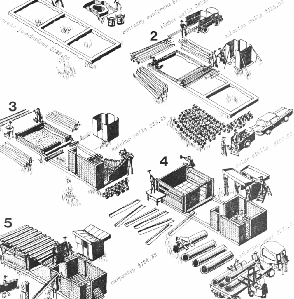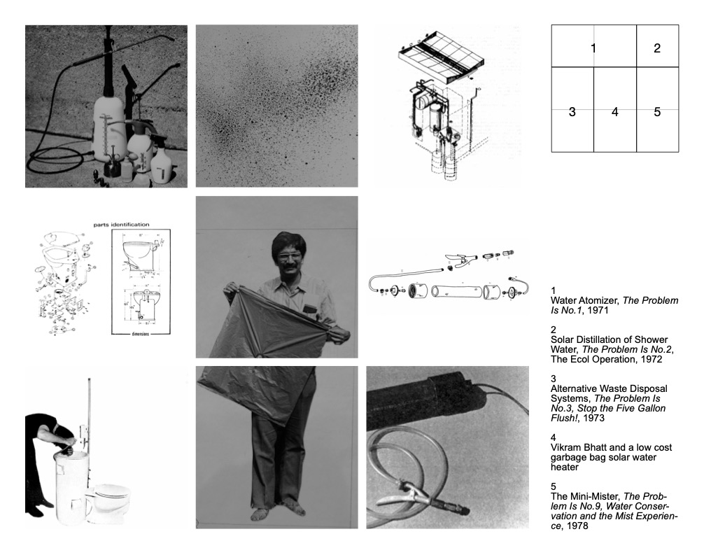 Potable water is a precious and scarce resource, so MCHG focused on conserving fresh water and dealt with low-cost infrastructure, particularly unconventional waterless sanitation experiments. In 1973, MCHG started exploring alternative waterless waste disposal systems and provided instructions for building composting toilets from the end-user perspective, confronting numerous challenges. This aspect of the MCHG’s novel work was quite varied and involved solar distillation to purify water, water harvesting or rain collection, recycling, garbage bag solar water heaters, atomisation to wash and conserve water, and mist showers (figure B). The outcome of this research produced two of the most successful MCHG publications entitled Stop the Five Gallon Flush and Water Conservation and the Mist Experience. The publications bridged international development research, the appropriate technology movement, countercultural lifestyle publishing and ecological design. This aspect of MCHG’s work was sometimes naturally overtaken and pursued by industry and local groups; today, the minimal water-using flush-toilets, showerheads, and faucets have become a standard utility. In India, Sulabh International, an NGO, successfully developed minimum water use composting toilets by understanding the interface between the user and the toilet and the common cultural practice of using water for cleansing. To date, Sulabh has converted millions of bucket latrines into low-flush toilets or pour-flush as they are popularly known.