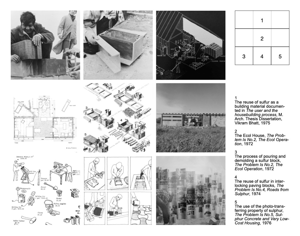 Recovering, recycling and reusing widely available, inexpensive materials like sulphur, MCHG used simple tools and technologies to transform them into small building components such as interlocking blocks for walls, floors and roofing. This experimental work was the first pragmatic step into the domain of ‘minimum cost’ technologies for the group. The tools used were adapted to limited resource settings to enable construction by a small group of individuals (figure A). The 1972 ECOL autonomous house for warm climates on McGill’s MacDonald Campus and the 1974 Maison Lessard, St-François-du-Lac, Quebec, designed for cold temperatures, demonstrated the innovative approach of the team and the potential of sulfur and other unconventional materials in buildings. Due to the rapid price increase of sulphur, related material research was discontinued; nevertheless, assembling small DIY modular components remained a distinctive characteristic of the MCHG’s work, and it was carried further into practice and even commercialised by colleagues.
