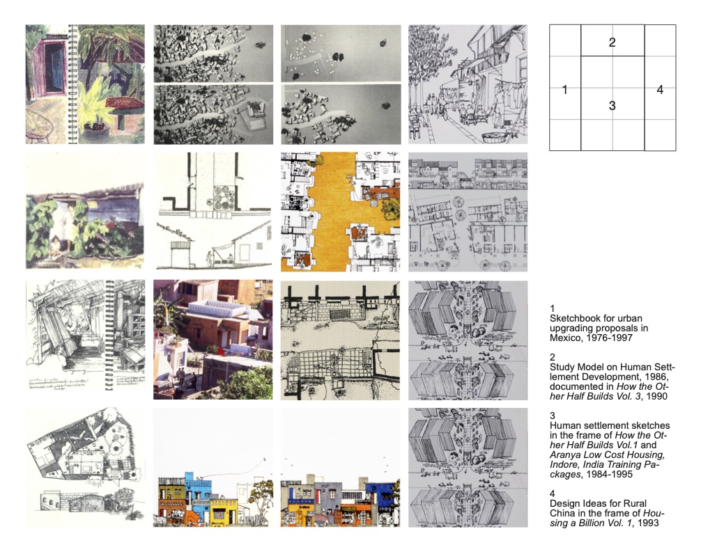 From the early 1980s onwards, the group started to document the architecture and spatial practices of informal settlements and their inhabitants, allowing MCHG to scale the work from small technologies to urban plans. The publication ‘How the other half builds, vol. 1′ (1984) captures the collaborative study with Balkrishna Doshi’s Vastu-Shilpa Foundation that was later applied in the award-winning Aranya low-cost housing project, for which the MCHG also designed a 200-house neighbourhood. Aranya became a teaching example in architectural education and for the municipal-level government staff working on the low-cost urban housing issues; it was further developed into self-contained audio-visual training packages. The MCHG team spent time in India, China and Mexico. It carried out intensive visual documentations of patterns and ways of living, crucial to deriving culturally appropriate norms from diverse lived experiences[5] (figure C).