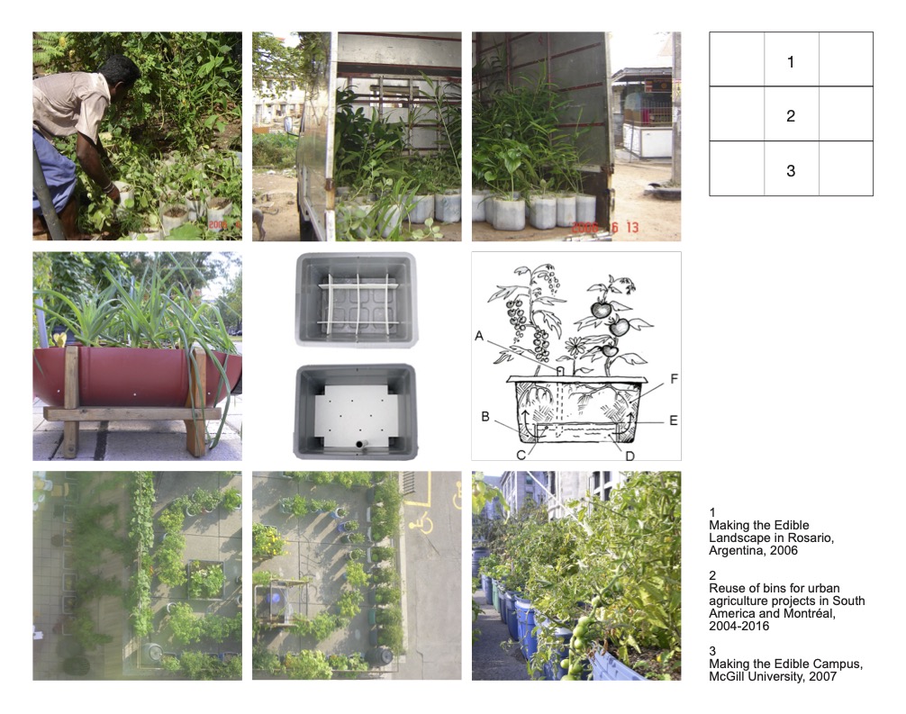 MCHG created varied edible landscapes by incorporating productive urban growing in different settings. The field has come to be known as urban agriculture, a misnomer because urban edible growing complements but cannot replace traditional agriculture. The rooftop gardens, a containerised edible campus garden of McGill University and different types of productive growing within poor neighbourhoods of Colombo, Sri Lanka, Kampala, Uganda, and Rosario, Argentina, are some projects that MCHG worked on (figure D). They show the range, flexibility and potential of this ecologically driven design thinking and are the reason behind the widespread acceptance and spread of this idea around the globe.