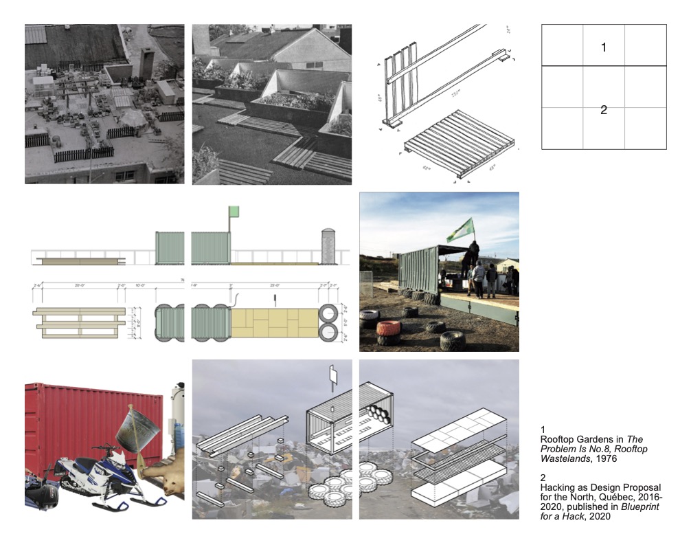 MCHG’s exploration into ‘hacking’, making do with whatever is at hand, began in the 1970s, focusing on transforming urban environments. This practice involved transforming empty rooftops in Montreal into urban gardens, documented in ‘Rooftop wastelands’ (1976). This early initiative showed the power of hacking to produce low-cost design solutions. The MCHG’s hacking application further emphasises the potential of recycling and reusing discarded materials and existing technologies. The group’s most recent project, Reconfiguring the North, carried out with the Northern Canadian community of Kuujjuaq, and described in the book Blueprint for a Hack (2020), illustrates the significance and widespread practice of DIY up-cycling culture and how to leverage it (figure E).[6] This hacking mindset enabled the MCHG to create sustainable, community-centred solutions with minimal resources throughout their work.