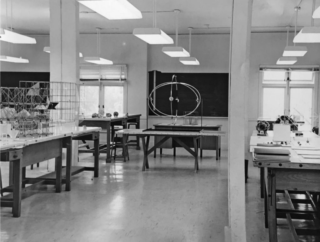 Maximizing the number of productive nodes enmeshed in the network was one strategy for raising the status of the research. Bauhaus founder Walter Gropius and design theorist Horst Rittel both made visits to the Institute, and Richard Buckminster Fuller frequently stopped by on visits to Los Angeles during the development of the ‘World Game’ in the 1960s. Ludwig Mies van der Rohe also visited once, and by one student’s recollection, the ailing master had to be lifted upstairs to the Institute by means of a forklift in the armory hall. Fritz Haller, too, was a collaborator of the Institute from 1966 to 1971, developing grid structures that anticipated his later commercial designs for building systems.