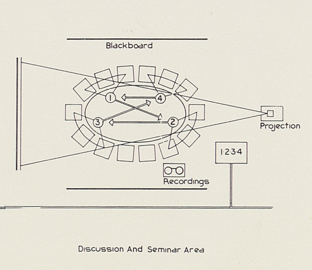 Successive drafts of the Institute’s floorplan incrementally adapted the building to the structural clarity of the institutional diagram. Each space was developed in light of the essential activities of the Institute. For instance, the ‘laboratory’ would be a machine shop for producing research prototypes, and the ‘information centre’ would provide a hard-wired connection to USC’s mainframe computer and “include every possible medium of communication”, according to its creator.