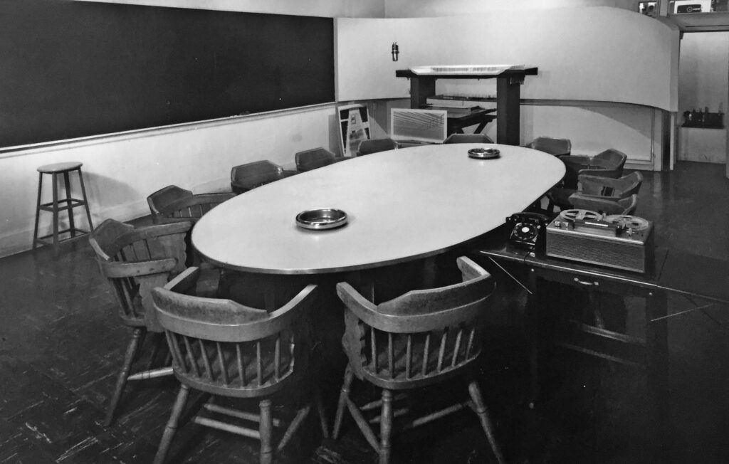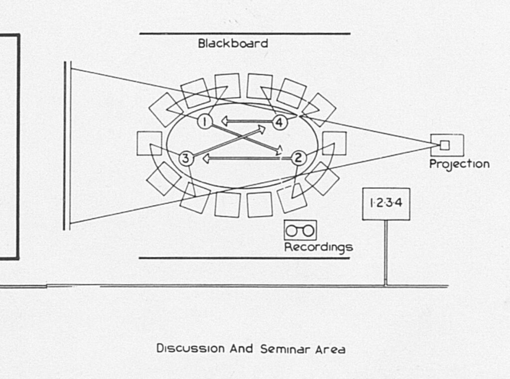 But the conference room was the true heart of the Institute. Following the seminar protocols that Wachsmann had invented in the 1950s, structured discussions around the oblong table would be recorded and entered into the Institute’s database for future reference. The ability to capture information as soon as it was broadcast allowed the Institute to close the feedback loop back upon itself, recapturing information as an asset to future research. The social functioning of the room was strictly planned in Wachsmann’s curriculum charts, which include a seating plan for optimum discussion between teams. Like the Building Institute’s other spaces, the conference room was designed to facilitate the production and transmission of information. Whether taking the form of models, drawings, lectures, photographs, films or prototypes, the Institute’s essential preoccupation was the circulation of information.