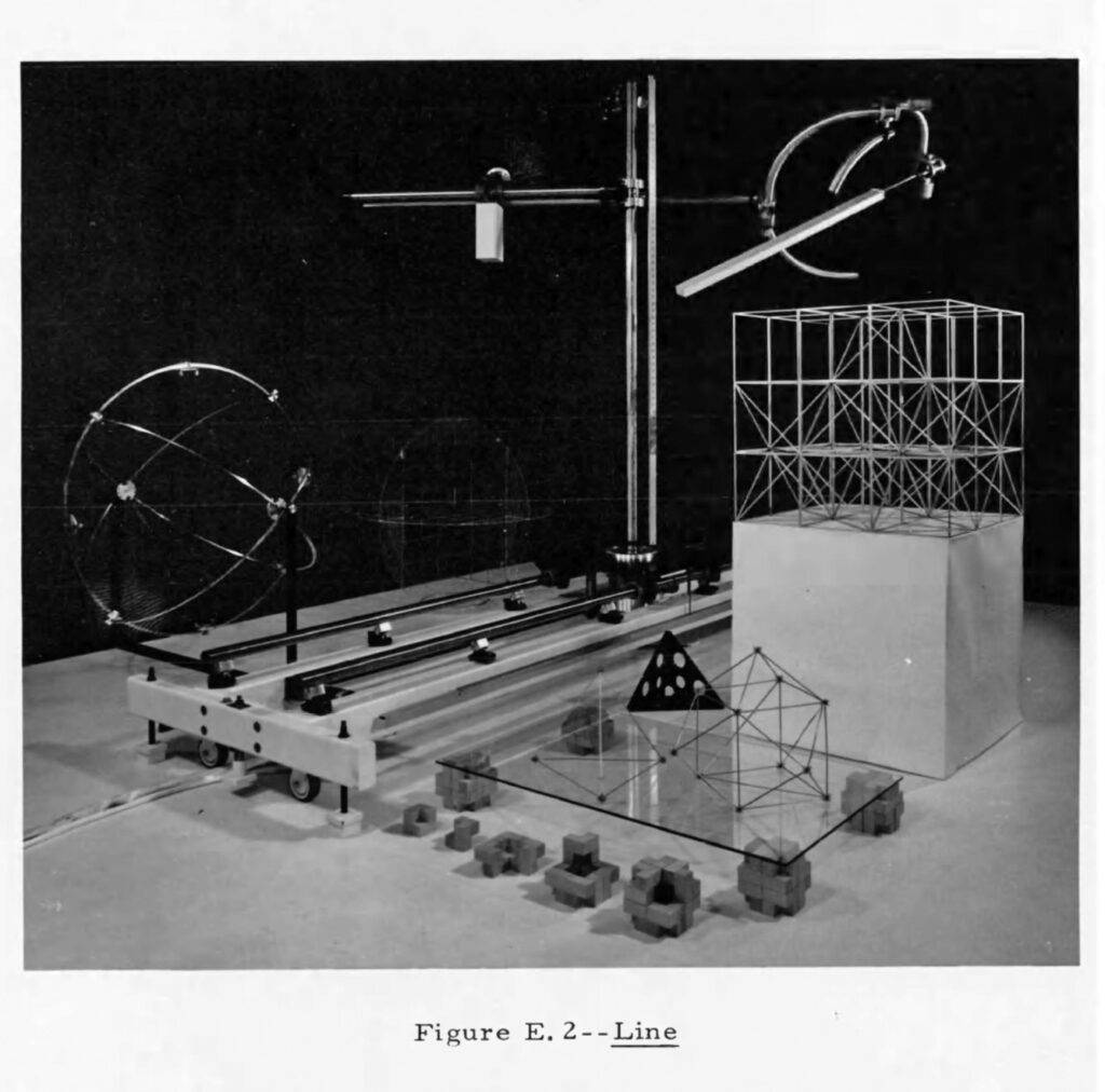 Whereas the earlier study of structural systems for the California City City Hall was developed in the context an architectural project, the L.O.M. device had no such immediate applications. Rather, the creation of this instrument for studying the problems of building assembly was itself the research agenda.