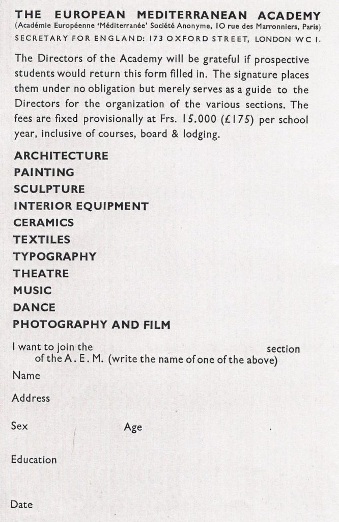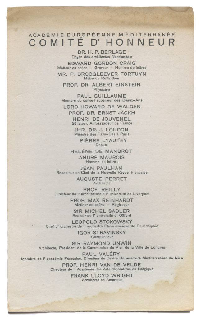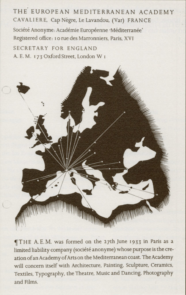 The inspiration for the project came without doubt from the Bauhaus, whose concept and genesis were familiar to both initiators. But Wijdeveld and Mendelsohn were keen to do more than merely transfer the progressive German art school to the sunny South. Naming their artistic educational institution the Académie Européenne Méditerranée (AEM) was programmatic. This knowingly set it apart from the workshop ideal of its reference object, alluded to the European body of thought and drew on the classical heritage of the Mediterranean region to forge its identity. The involvement of the painter Amédée Ozenfant as the third director activated finer points of French modernism such as purisme and retour à l’ordre, which are located in the literary and historic-philosophical context of la pensée de midi and longue durée.