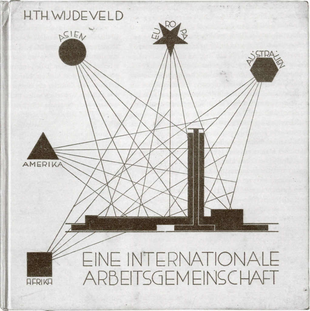 Alongside architecture as the parent discipline, he envisaged departments for metal, glass and woodwork as well as for ceramics, typography and textile engineering. Additional academic subjects and a demanding cultural programme were to be complemented by communal meals, sports and leisure activities and work on connected agricultural land. The architectonic plans included in the publication show a spectacular modern building complex which is captured in abstract form on the dynamic yellow and red cover. Reminiscent of a steamship, it rests on a global communication network that interconnects five continents. In terms of its programme, Wijdeveld places a focus – unlike the Bauhaus – on educating a multinational and polyglot community, its purpose being to stimulate creative energies.
